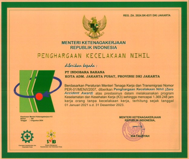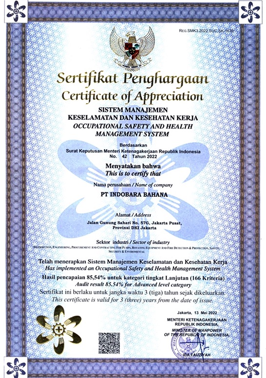 PT Indobara Bahana telah tersertifikasi ISO 9001:2015, ISO 14001:2015, ISO 45001:2018, dan SMK3, yang menunjukkan komitmen kami terhadap kualitas, keselamatan, dan keberlanjutan. Perusahaan kami juga telah menerima berbagai penghargaan dari pemerintah, prinsipal, dan pelanggan, menjadikan kami mitra tepercaya di berbagai sektor industri.
