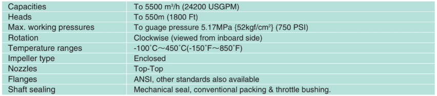 EBARA KS is a process pump with a double suction and centerline support design, compliant with API 610 standards, suitable for heavy-duty industrial applications.