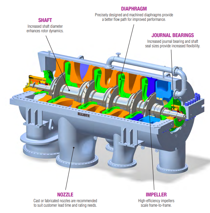 Elliot Multi Stage Centrifugal Compressors direkayasa untuk memberikan kinerja dan keandalan yang unggul di berbagai aplikasi industri. Didukung oleh inovasi lebih dari satu abad, kompresor Elliott menggabungkan kemajuan aerodinamis, rotordinamis, dan metalurgi mutakhir untuk memenuhi standar operasional dan lingkungan yang paling ketat. Dari desain casingnya yang kokoh hingga impellernya yang sangat efisien, kompresor Elliott dibuat untuk lingkungan yang menuntut, memastikan efisiensi optimal, peningkatan stabilitas, dan pengurangan biaya perawatan untuk proses penting Anda.
