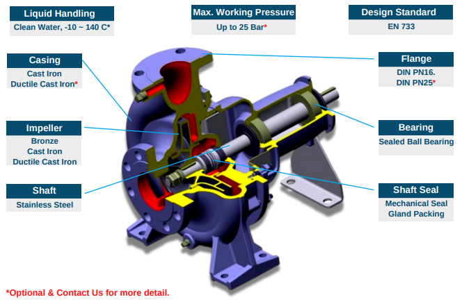 Dibangun sesuai dengan EN733 (dimensi pompa), EN12756 (segel mekanis), dan EN294 (pelindung), memastikan kualitas dan kompatibilitas global.