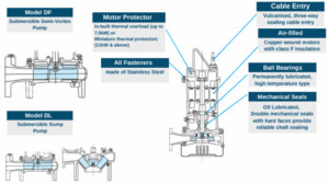 Pompa submersible yang dirancang dengan non-clog semi-open impellers untuk menangani air limbah atau kotoran. Pompa ini dirancang agar tidak mudah tersumbat, sehingga ideal untuk aplikasi yang memerlukan aliran bebas hambatan.